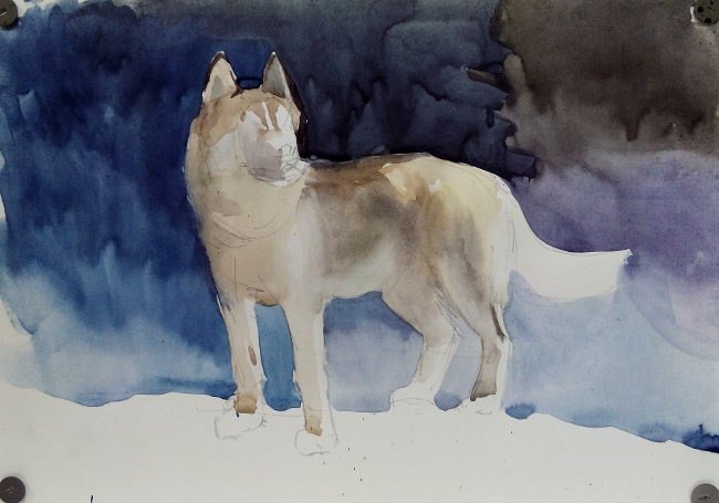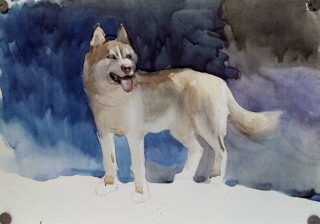 Хаски рисунок акварелью