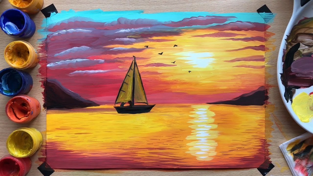 Рисование закат на море
