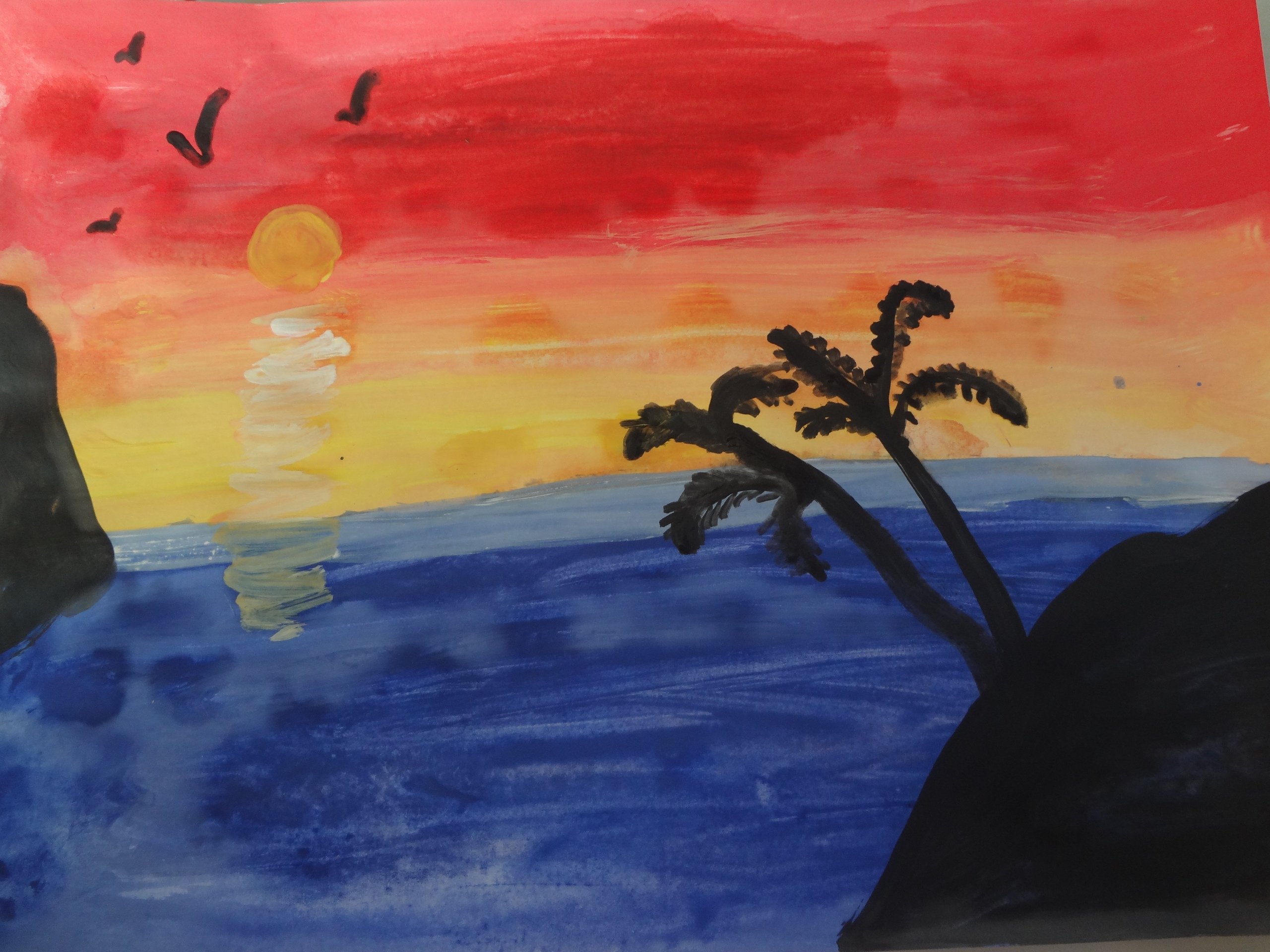 ![Закат на море гуашью]()