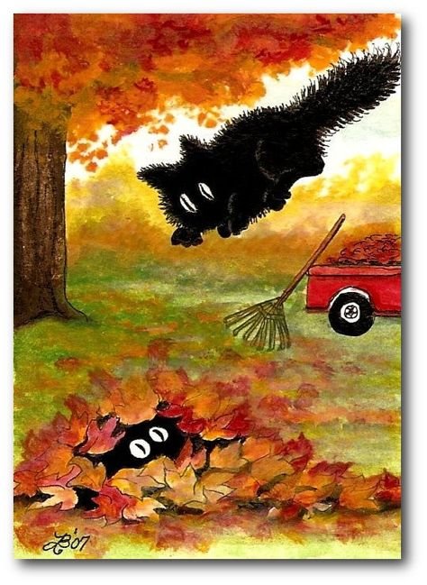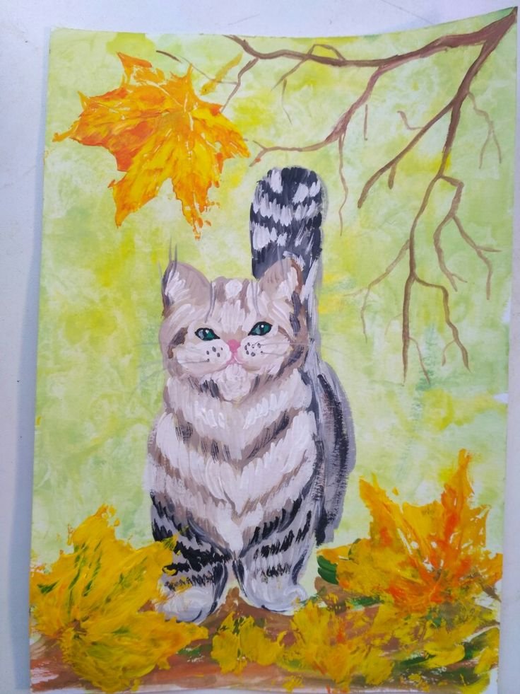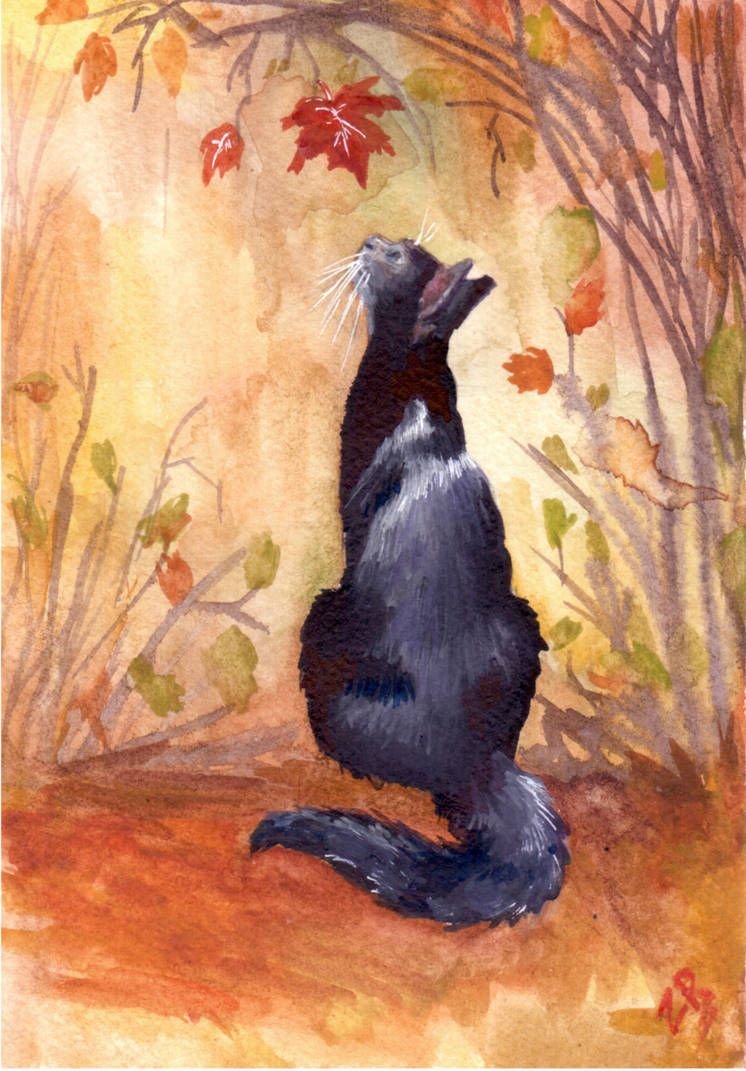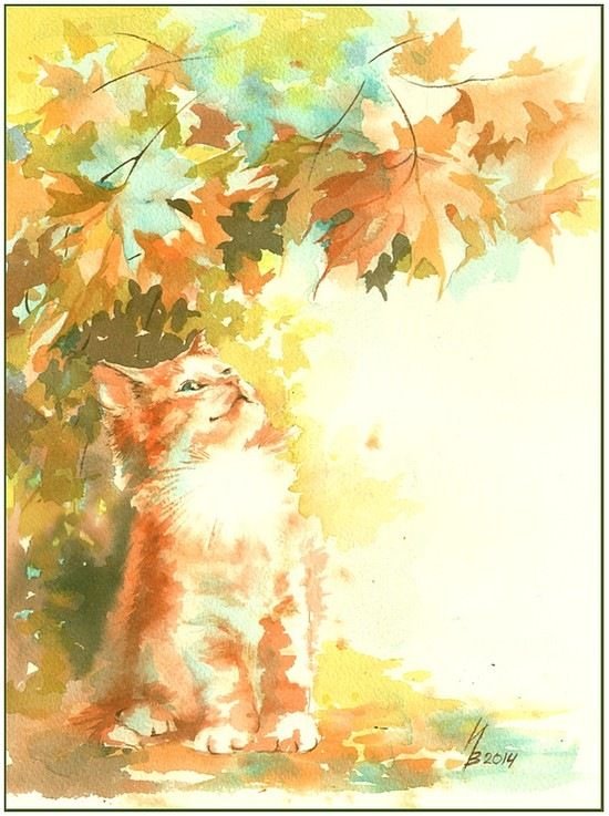 ![Кошка-осень акварель]()
