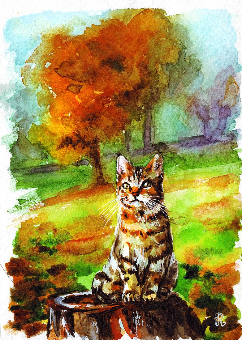 Осень, котик, акварель