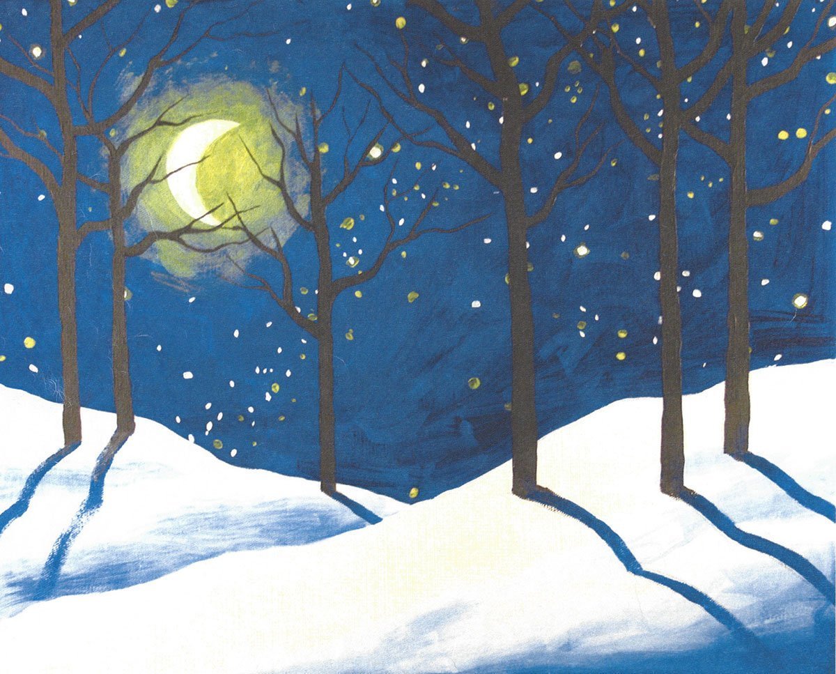 ![Ночной зимний пейзаж гуашью для детей]()