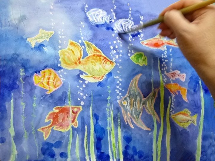 ![Аквариум акварелью для детей]()
