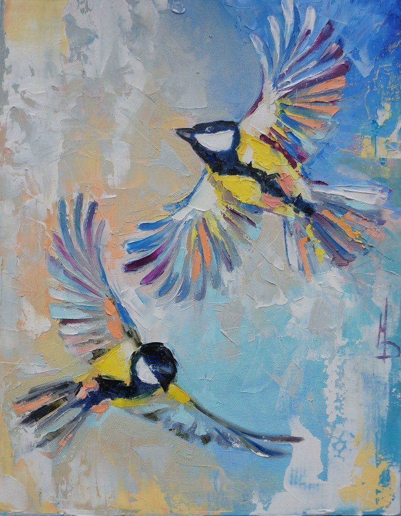 ![Синички на ветке краской]()