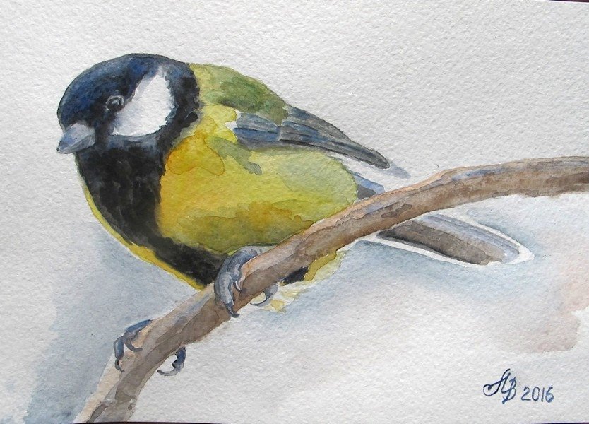 ![Синица на ветке акварель]()