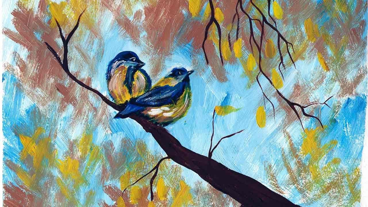 ![Птицы на ветке живопись]()