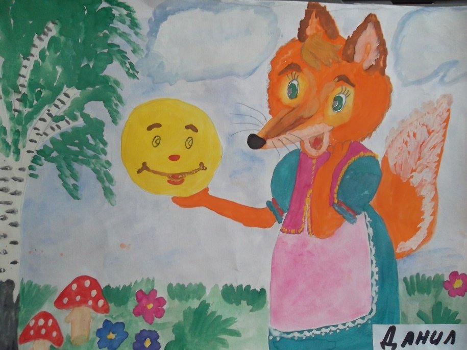 Детские рисунки лиса и Колобок