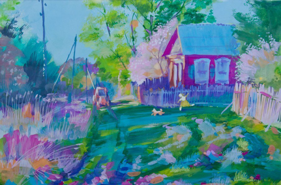 Пейзаж гуашью деревня