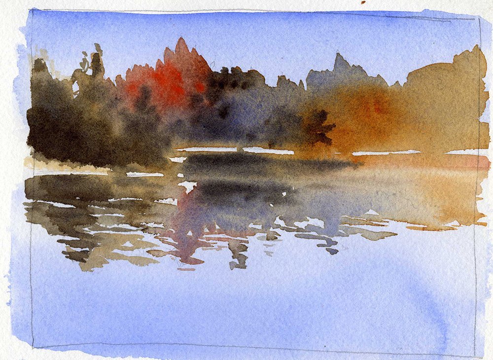 Этюд озеро акварелью