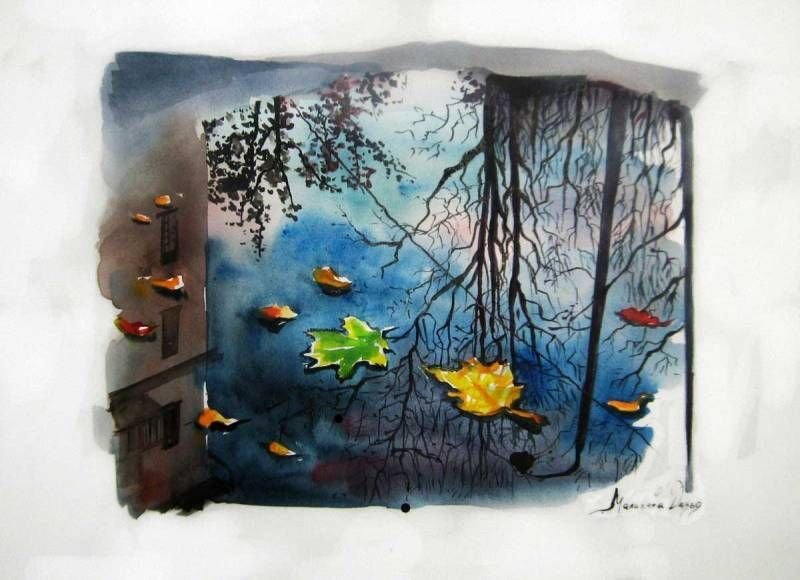 Листья в луже акварель