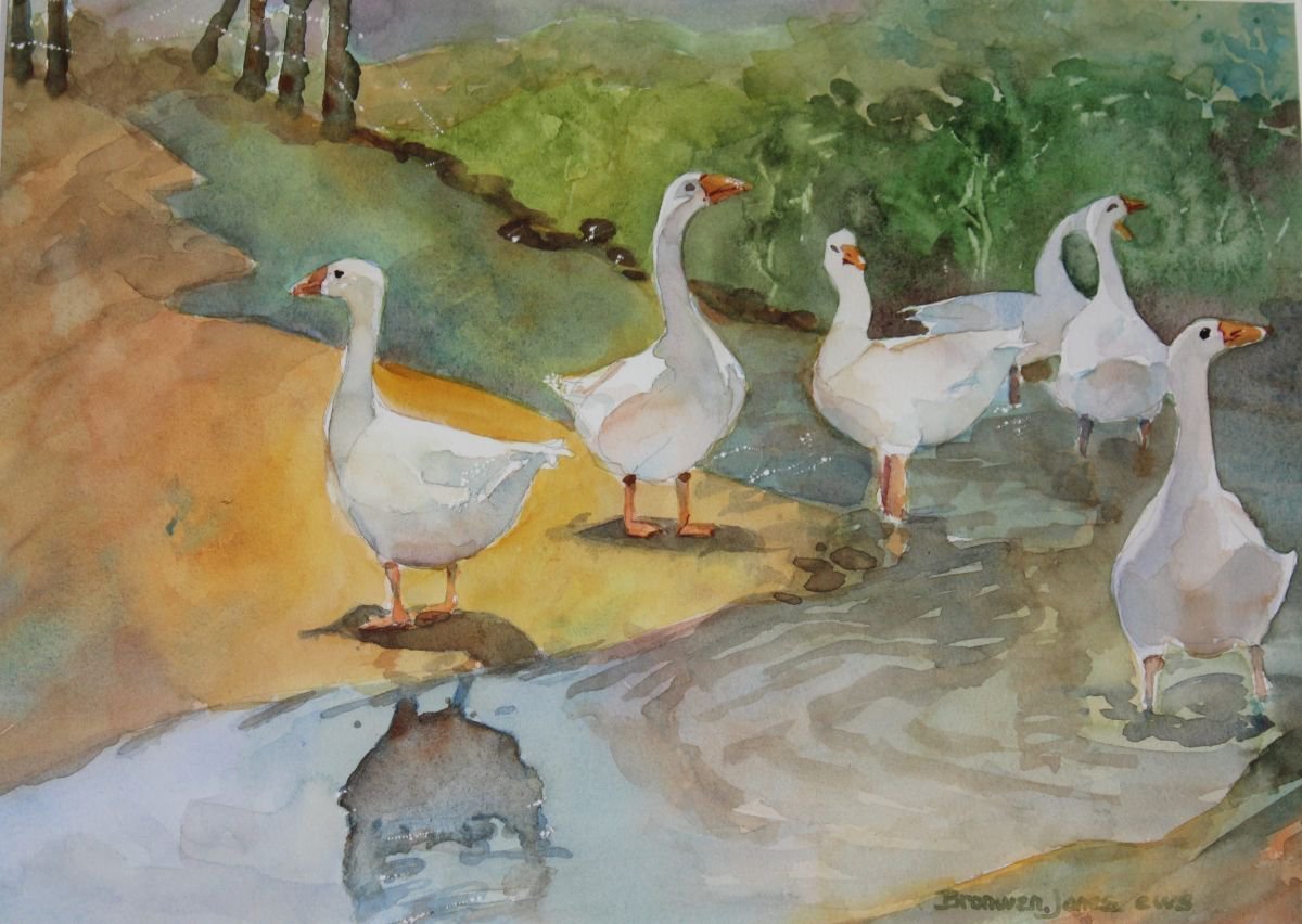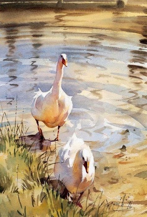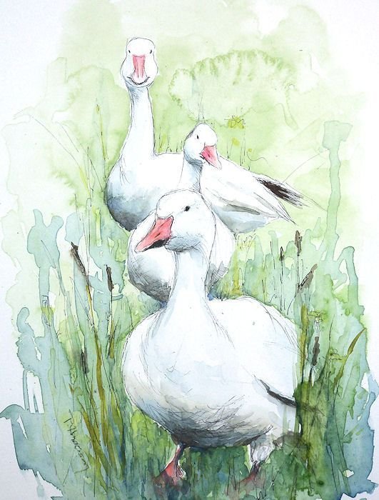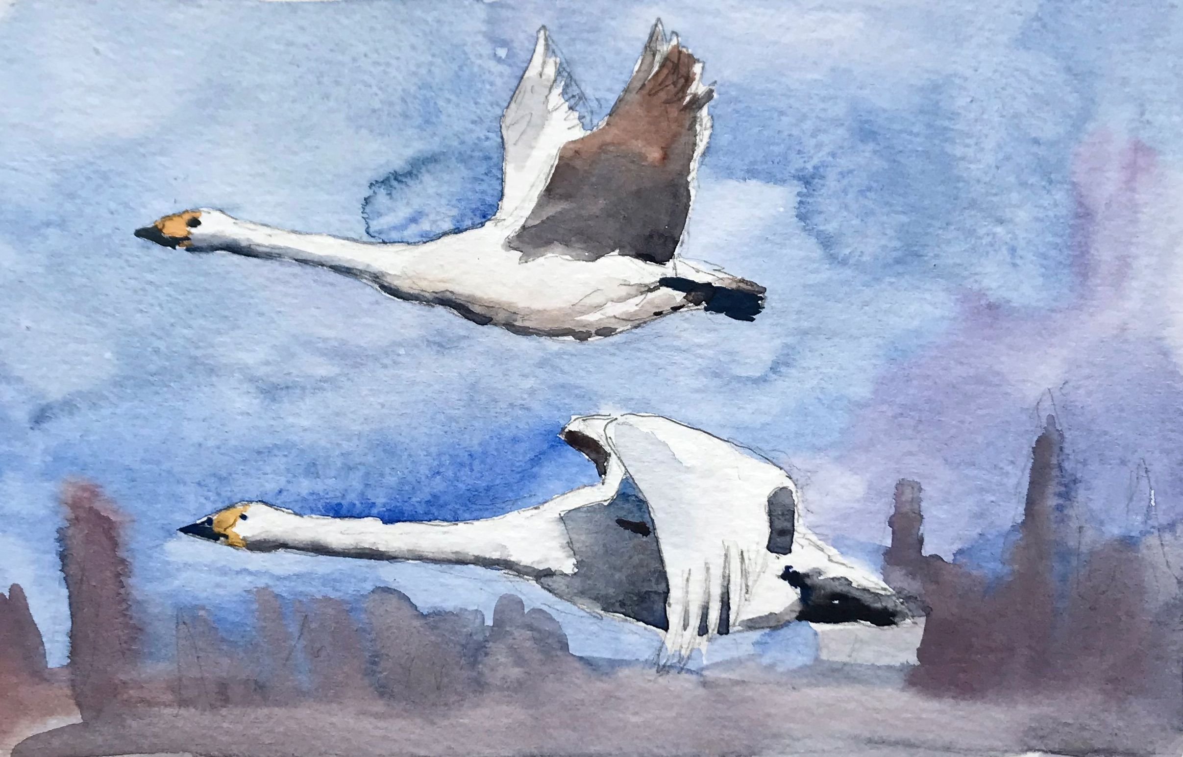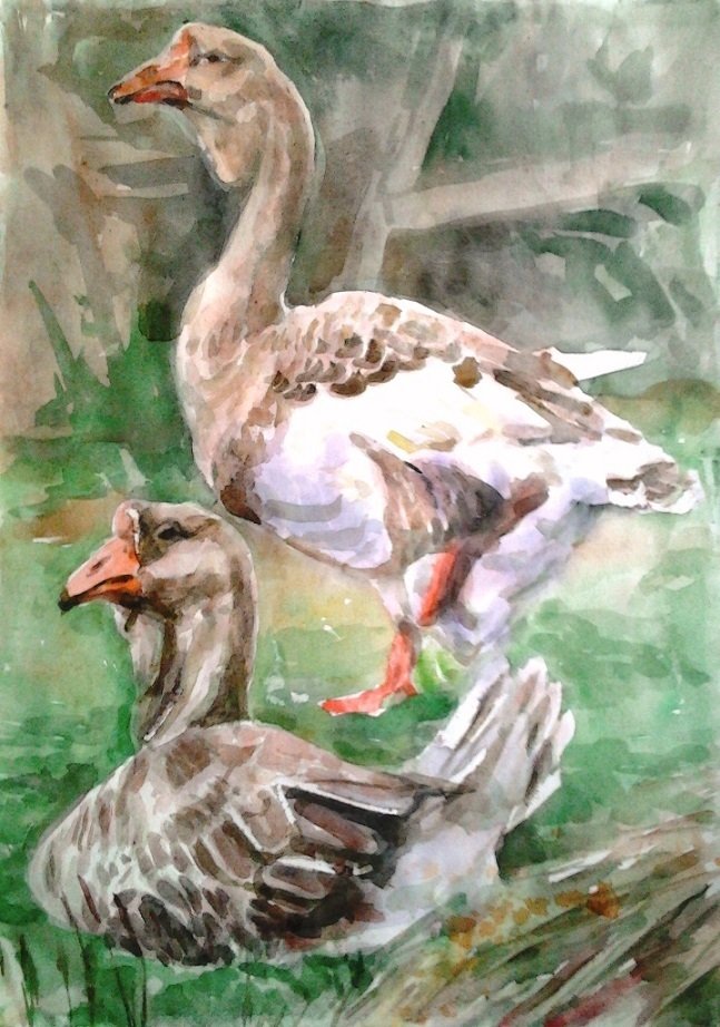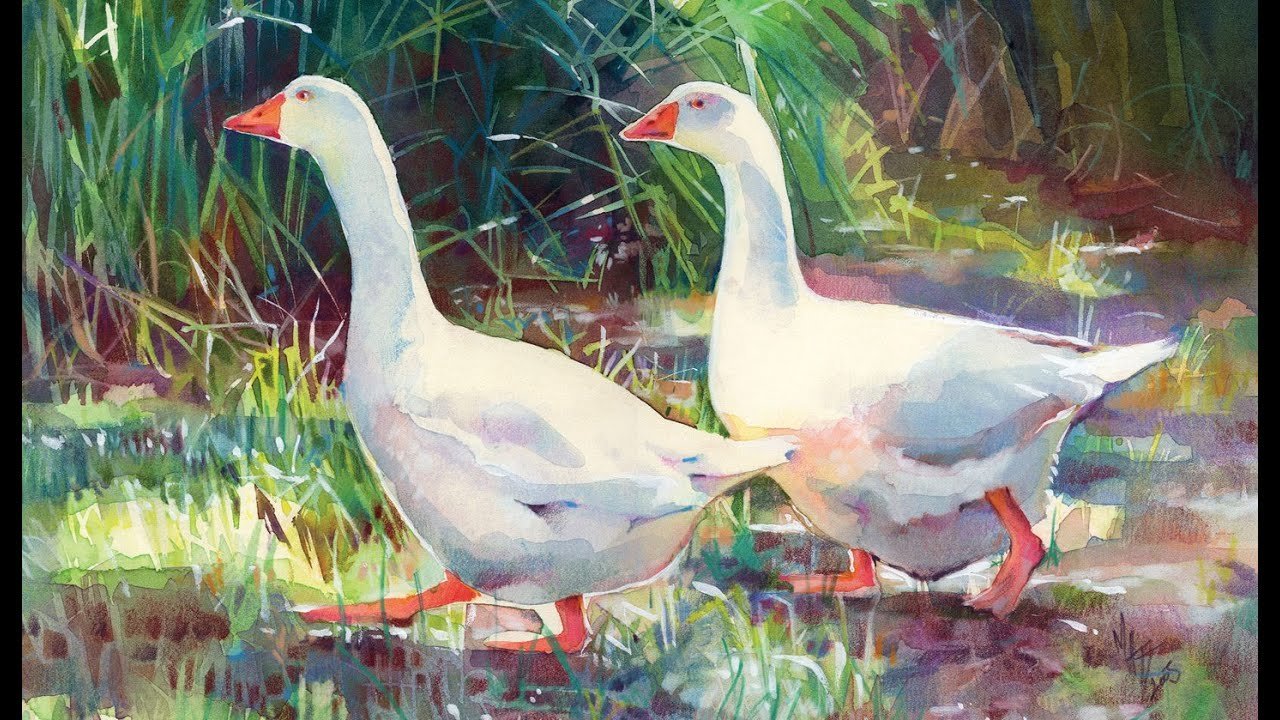 Гуси лебеди акварель