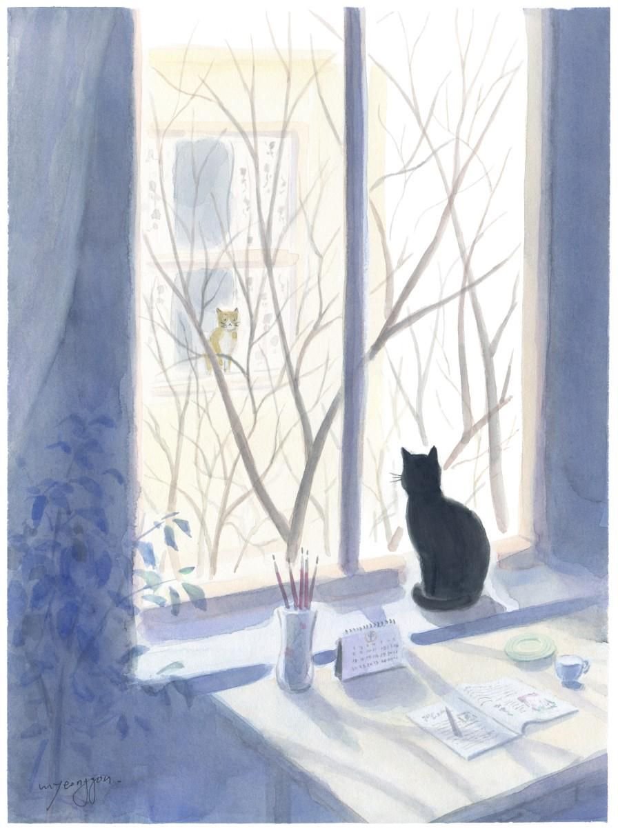![Кот на окне акварелью]()