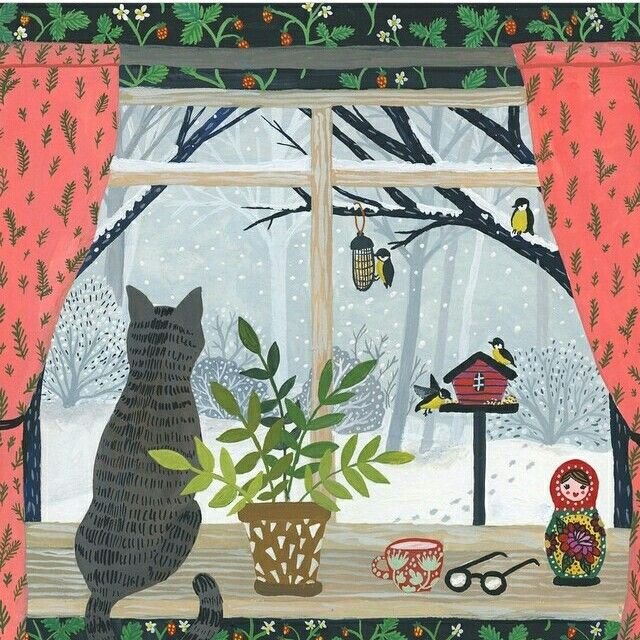 ![Зимняя композиция с котом на подоконнике]()
