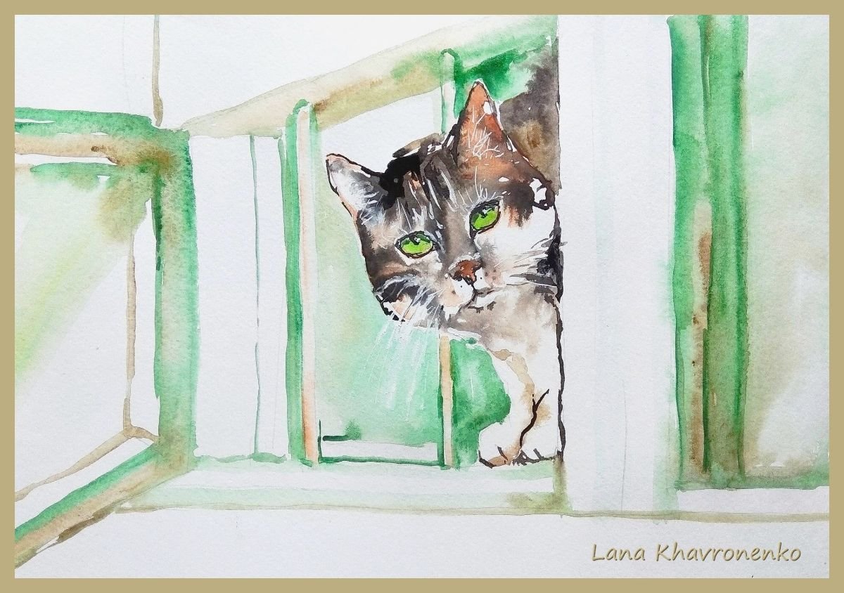 Кот на окне акварелью