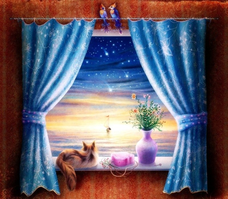 ![Кошка на окошке рисование]()