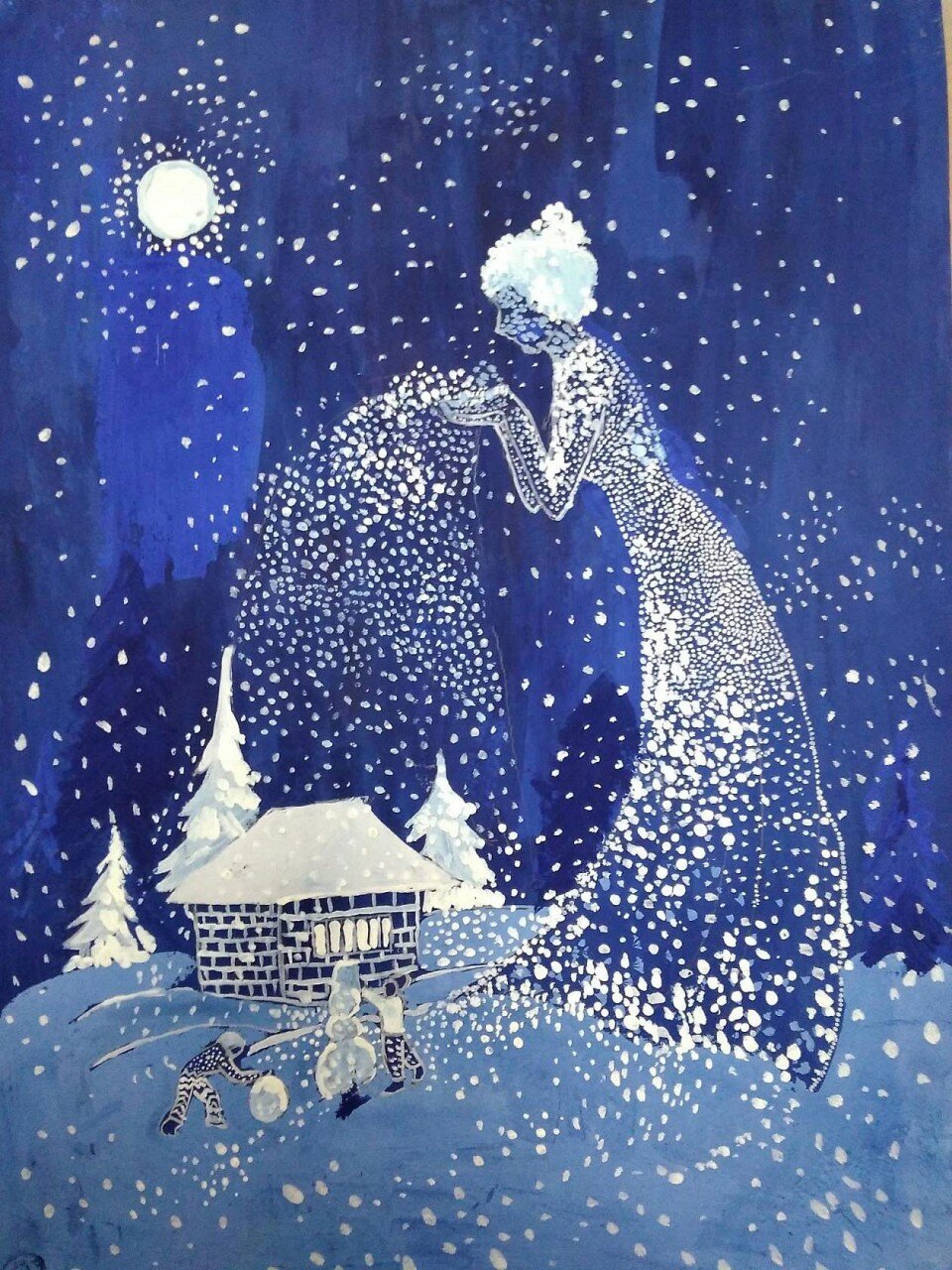 Ночной зимний пейзаж гуашью
