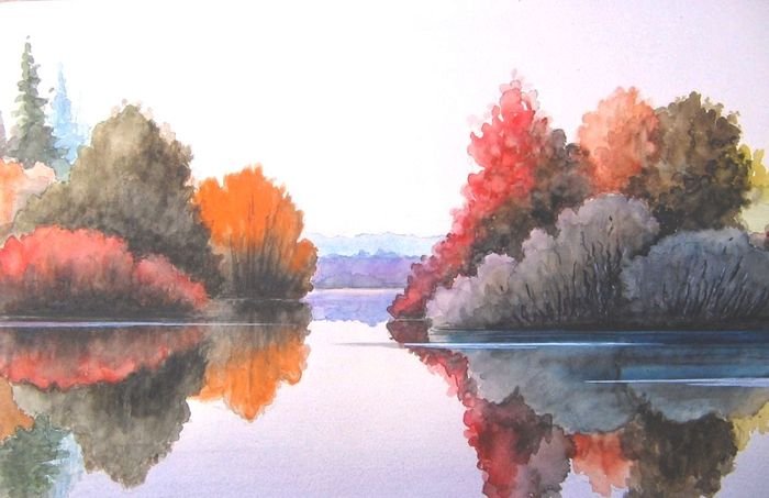 Отражение в воде акварелью