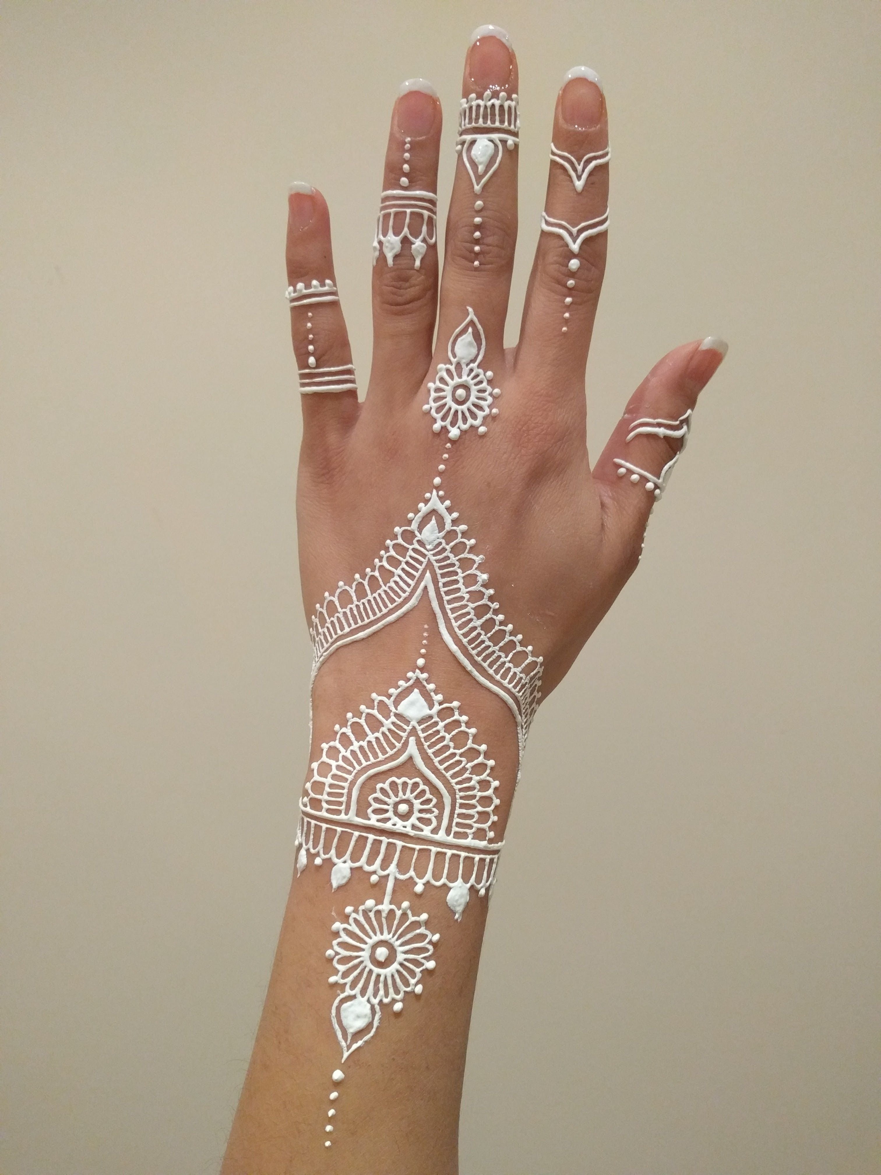 ![Белое мехенди на руке]()