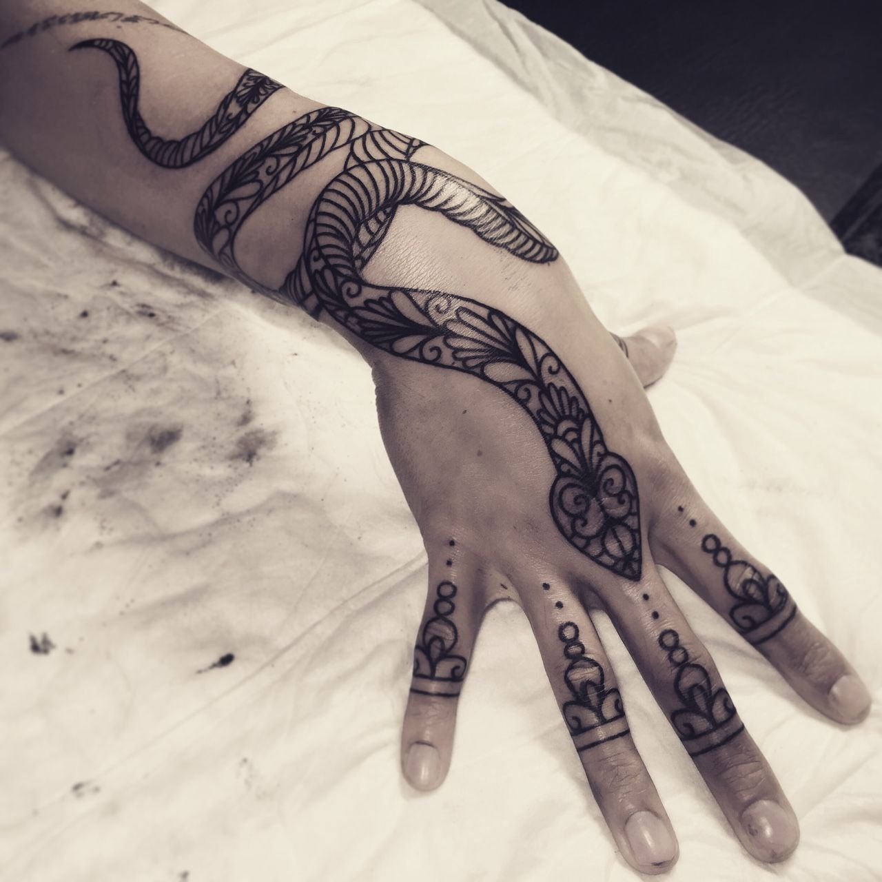 ![Тату хной змея на руке]()