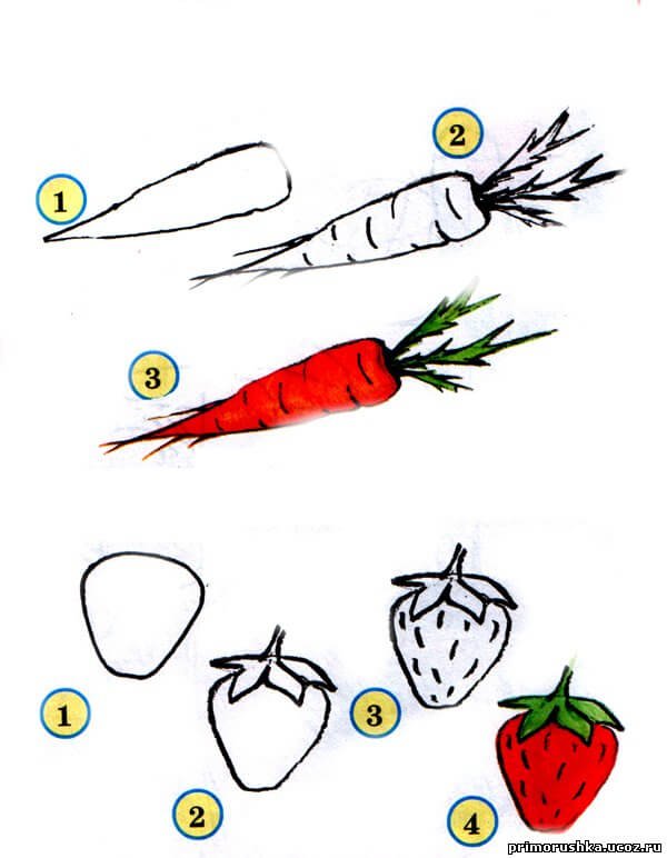 ![Схемы рисования овощей и фруктов для дошкольников]()