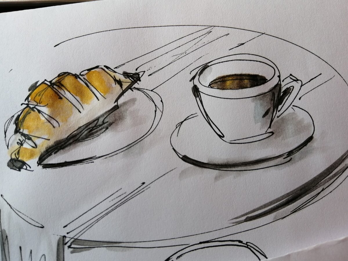 ![Кофе с круассаном рисунок карандашом]()
