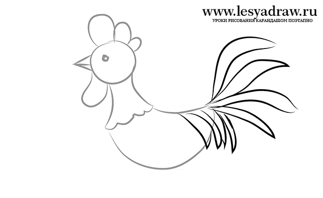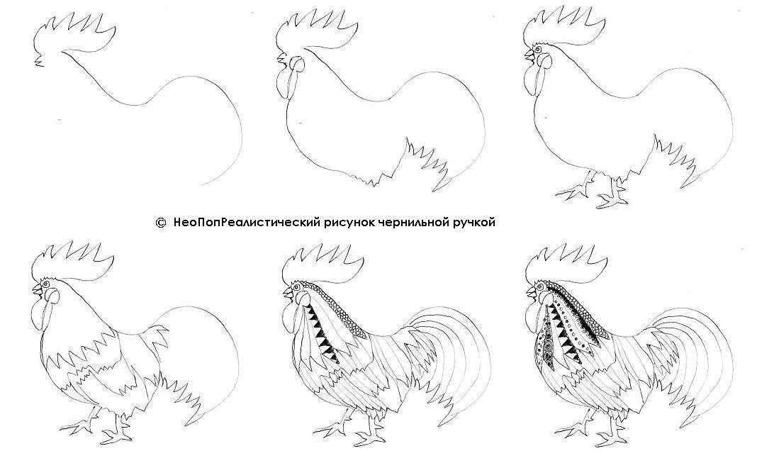 ![Поэтапный рисунок петуха]()