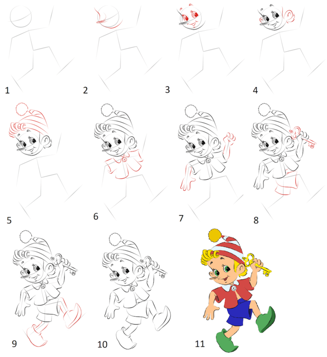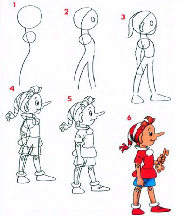 Буратино рисунок карандашом