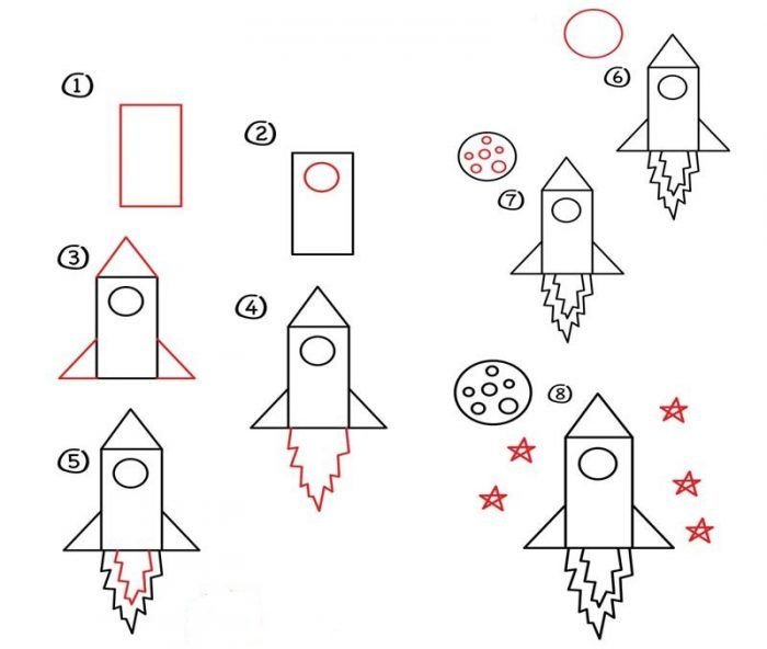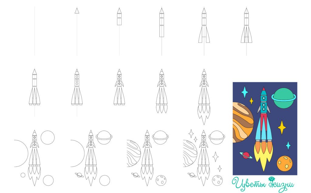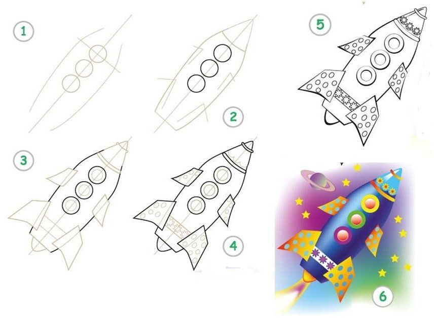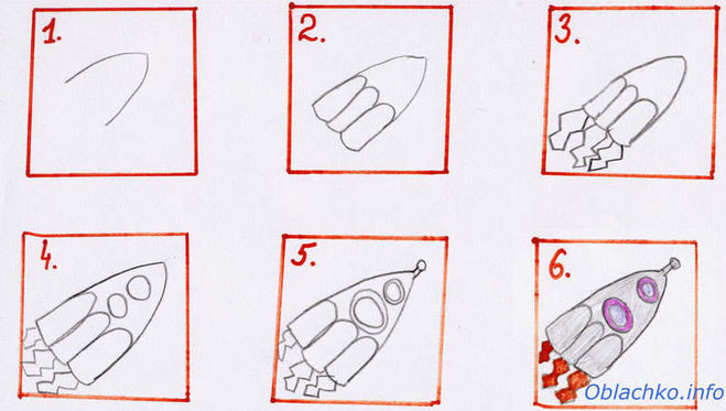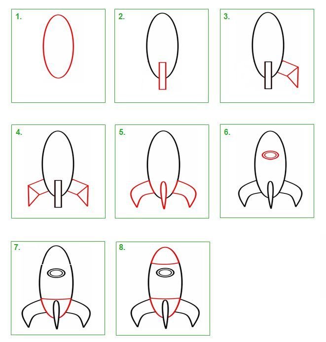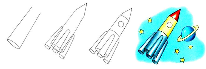 ![Поэтапный рисунок ракеты]()