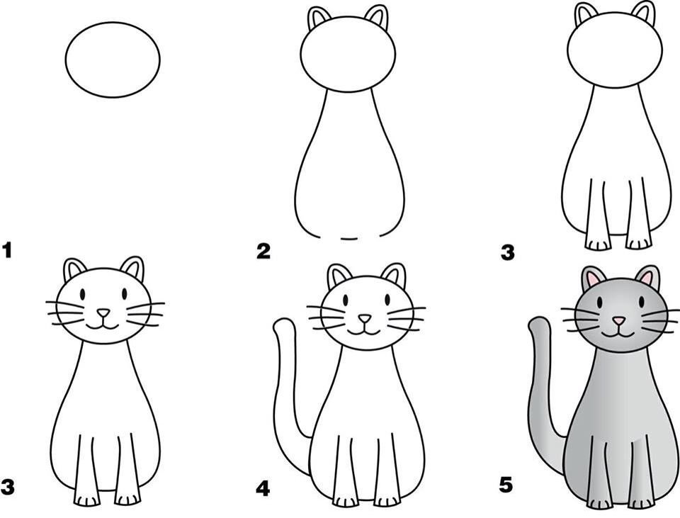 ![Схема рисования кошки для детей]()