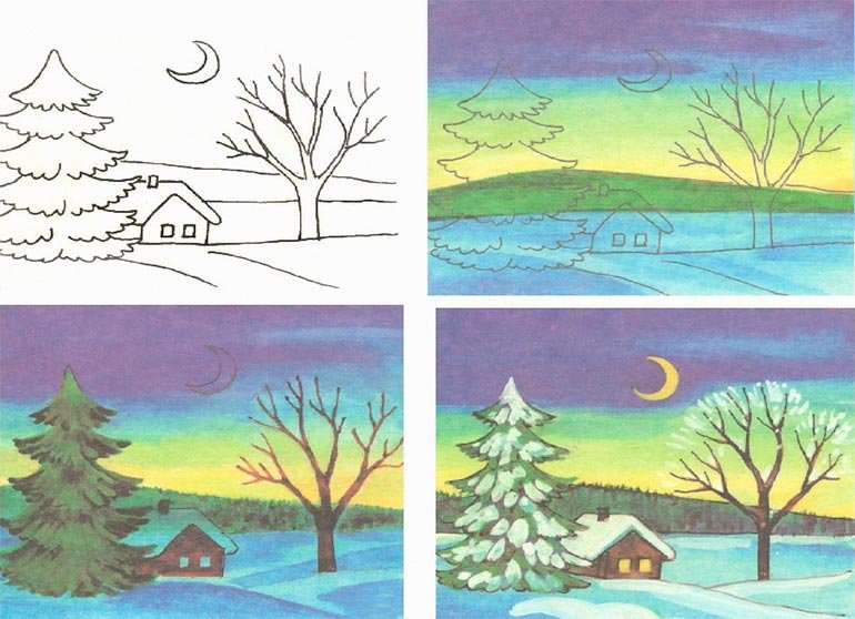 Зимний пейзаж поэтапное рисование для детей