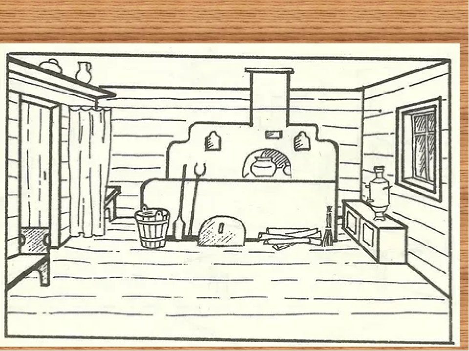 ![Русская изба внутри рисунок с печкой]()