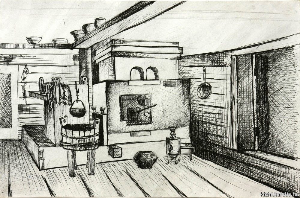 ![Интерьер русской избы карандашом]()