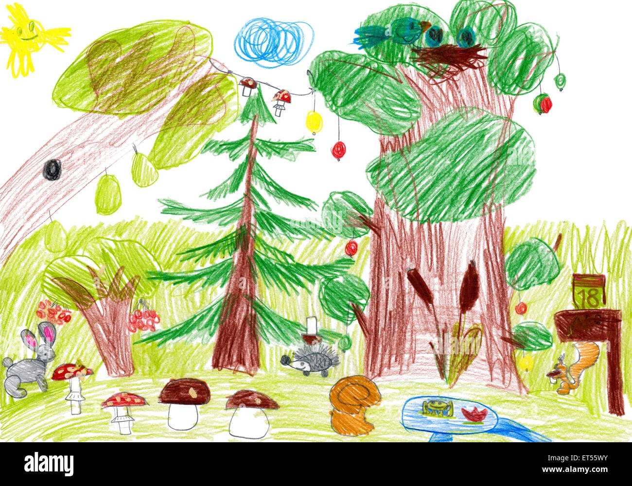 ![Лес цветными карандашами для детей]()