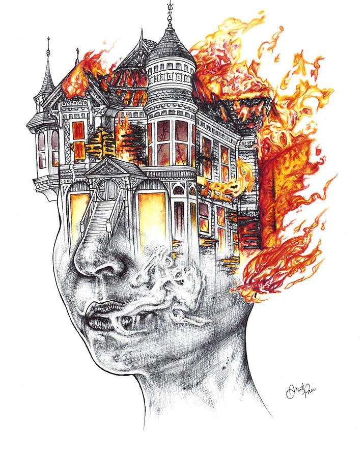 Давайте представим, что перед вами открыт лист белой бумаги. Ваш карандаш начинает танцевать по поверхности, оставляя следы своего тонкого графита. Постепенно на бумаге возникают очертания дома, но не простого дома, а горящего дома. Архитектурные детали, стены, окна – все набросано с некоторой спешкой и смазано дымом. Линии карандаша плавно переходят из яркого контура в мягкие тени, создавая эффект пожара, который охватывает каждый уголок здания. От этого рисунка просто захватывает дух: вы чувствуете жар и напряжение, которые передаются через вашу руку на бумагу. Горящий дом становится символом силы природы и мощи пламени, олицетворяющим силу разрушения и одновременно возможность перестроить и восстановить.