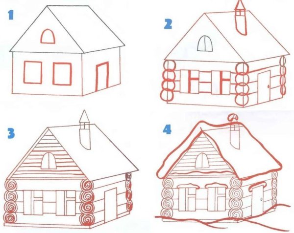 ![Этапы рисования избы]()