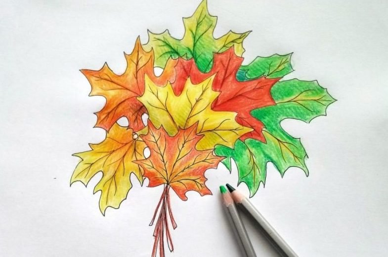 ![Рисование кленового листа карандашами]()
