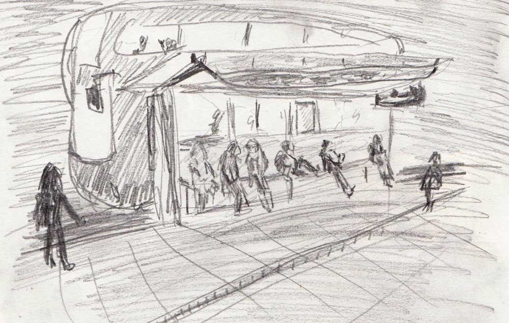 ![Наброски людей на остановке]()