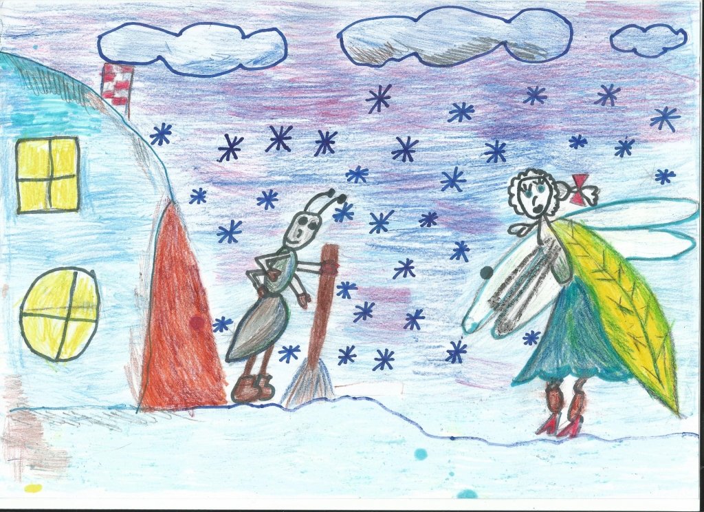 ![Детские рисунки к басням Крылова Стрекоза и муравей]()