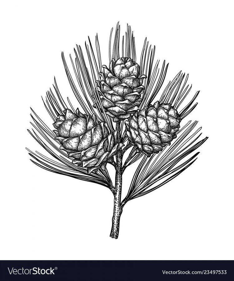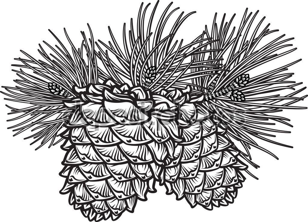 ![Сосна ветка с шишкой черно белый]()
