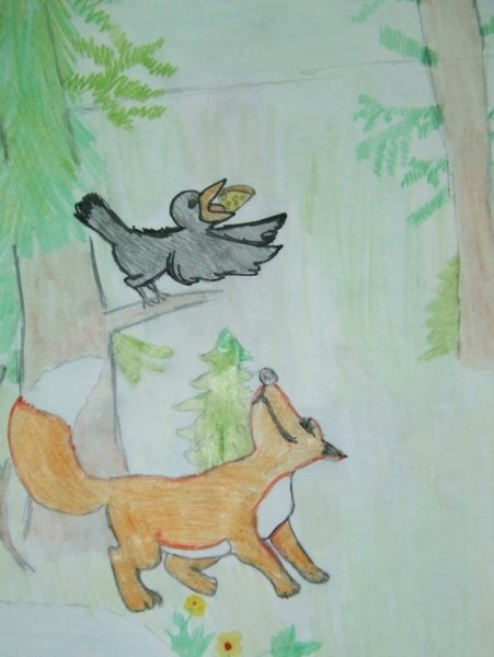 ![Иллюстрация к басне ворона и лисица карандашом]()