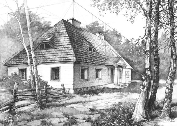 Дом в деревне - это уютное место, где можно насладиться спокойствием и природой. Этот карандашный рисунок передает атмосферу загородного дома с его традиционной архитектурой и окружающей зеленью. Одноэтажное строение с крышей из красных черепиц и высокими окнами создает ощущение комфорта и тепла. Вокруг дома видны деревья, цветы и птицы, что добавляет еще больше живописности и обаяния этой картине. Благодаря карандашным штрихам и деталям, рисунок оживает, заставляя почувствовать атмосферу деревенской жизни. Это идеальное произведение искусства для любителей природы и спокойного отдыха вдали от городской суеты.