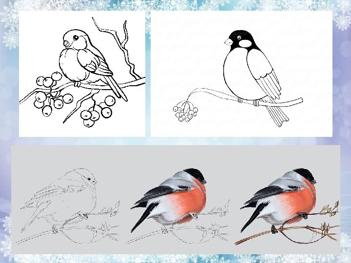 ![Этапы рисования снегиря]()