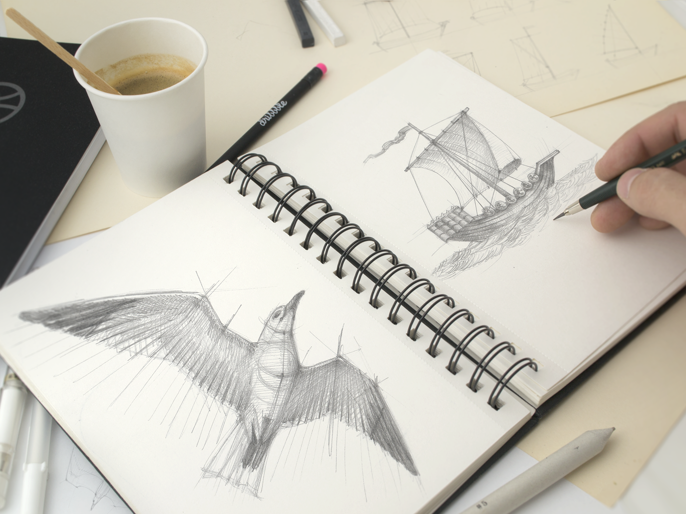 ![Зарисовки в скетчбук карандашом]()