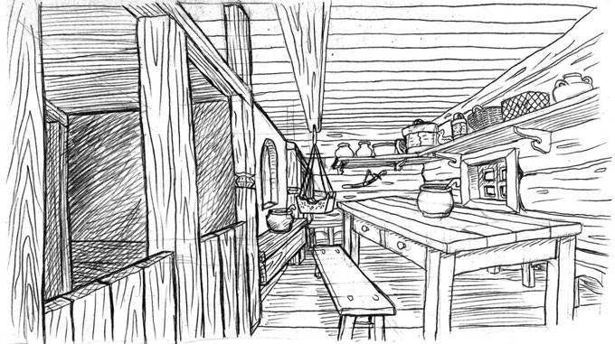 ![Эскиз интерьера избы]()
