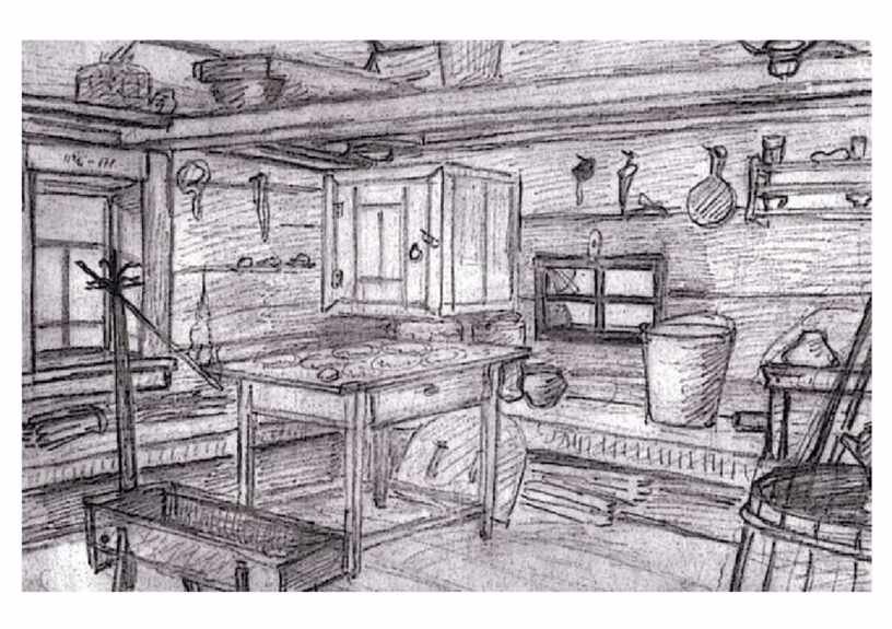 Внутреннее убранство русской избы карандашом