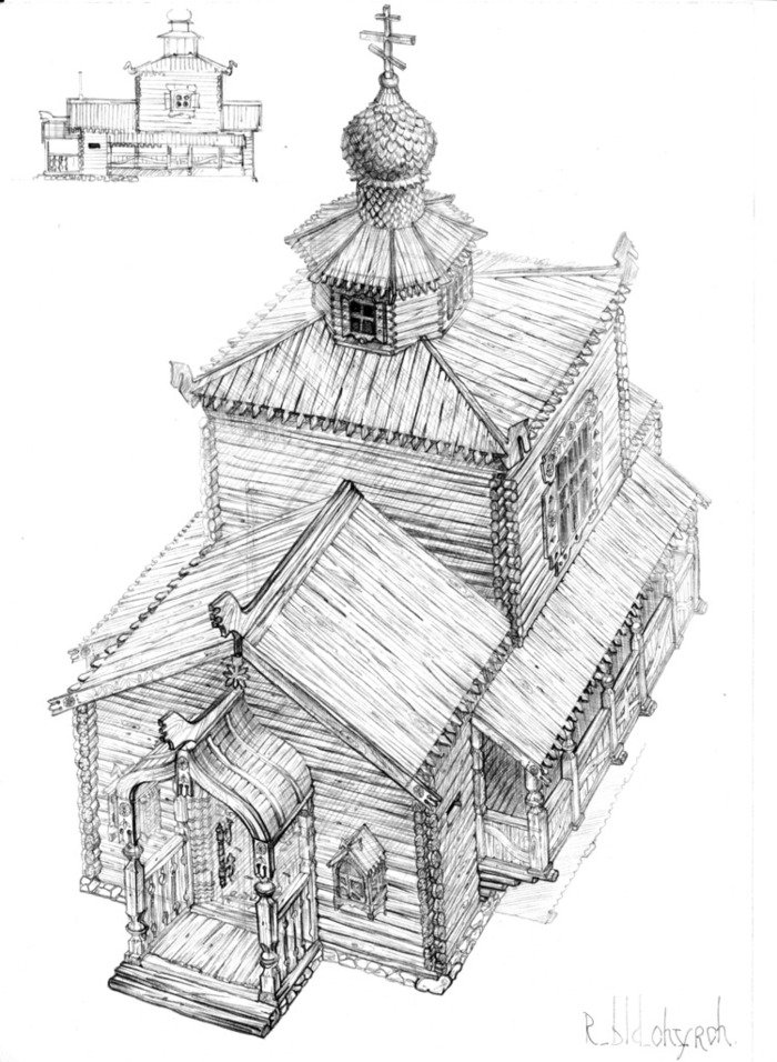 ![Зарисовка деревянного храма]()