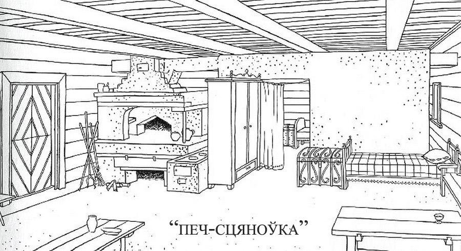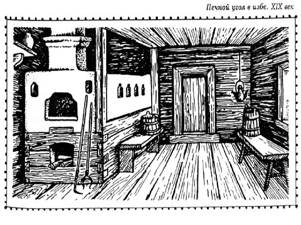 ![Русская изба внутри рисунок с печкой]()