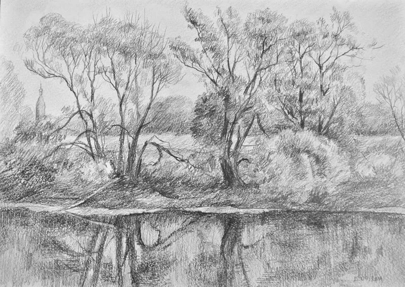 ![Водный пейзаж карандашом]()