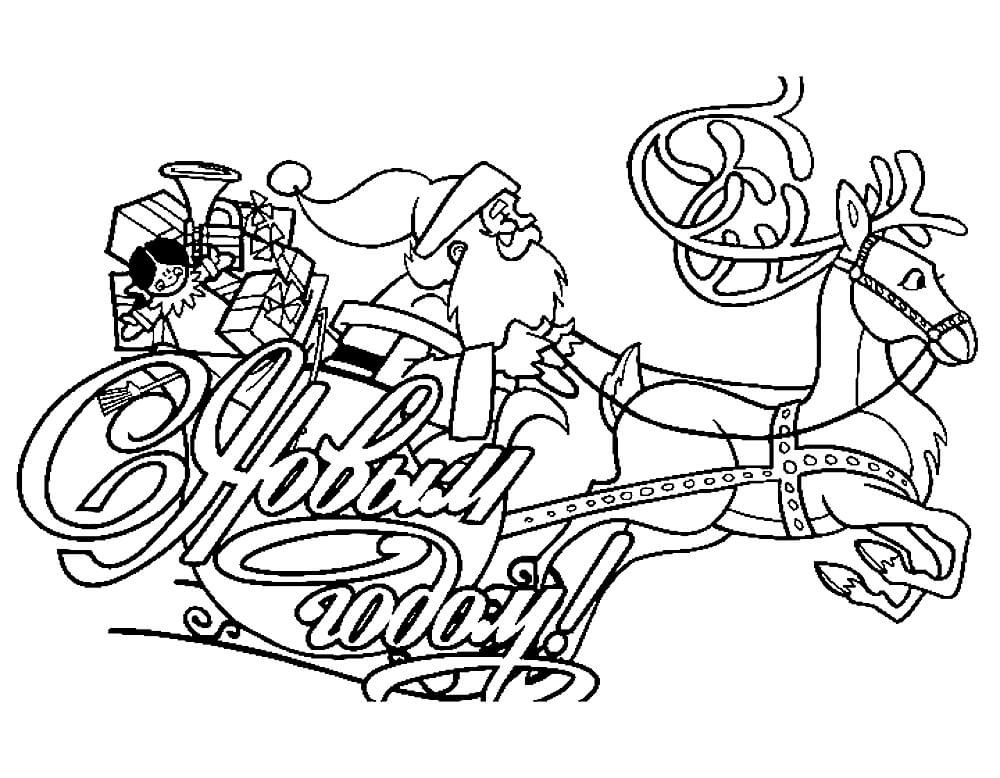 Раскраска дед Мороз на санях с оленями