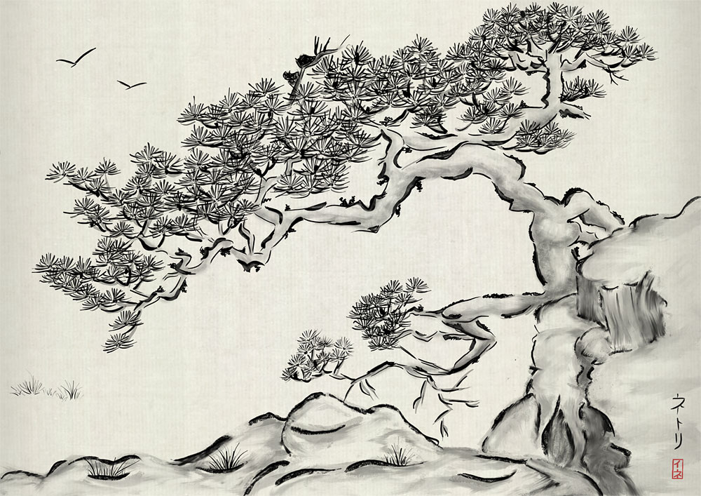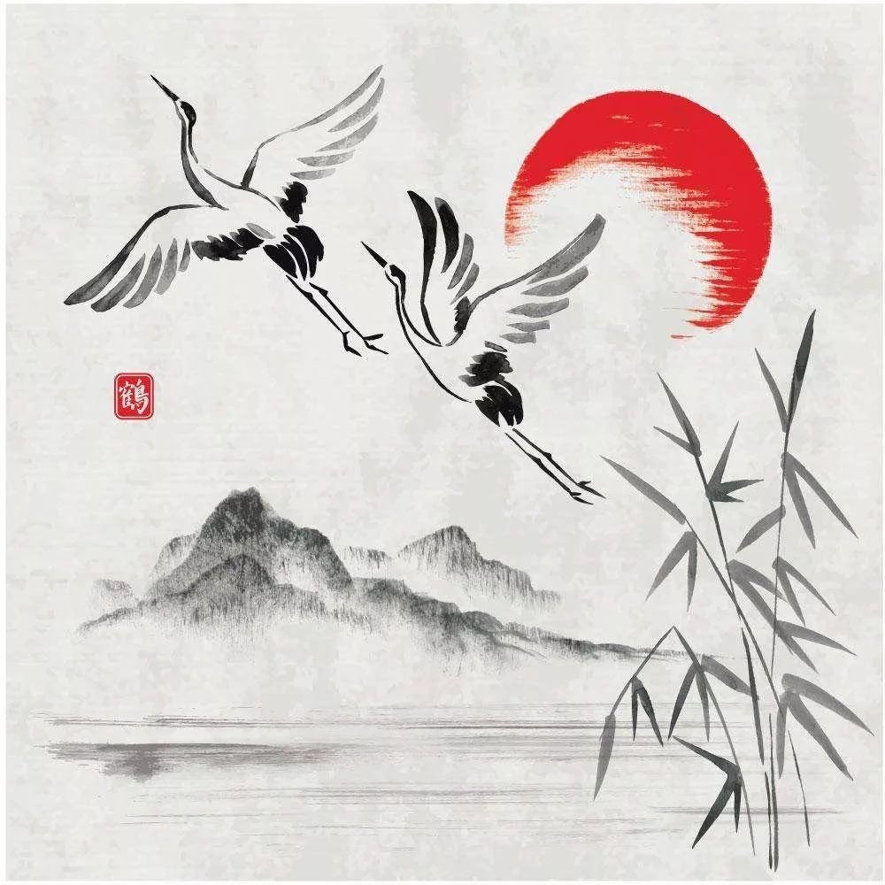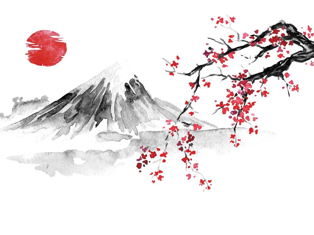 ![Японская живопись Суми-э Сакура традиционная гора]()